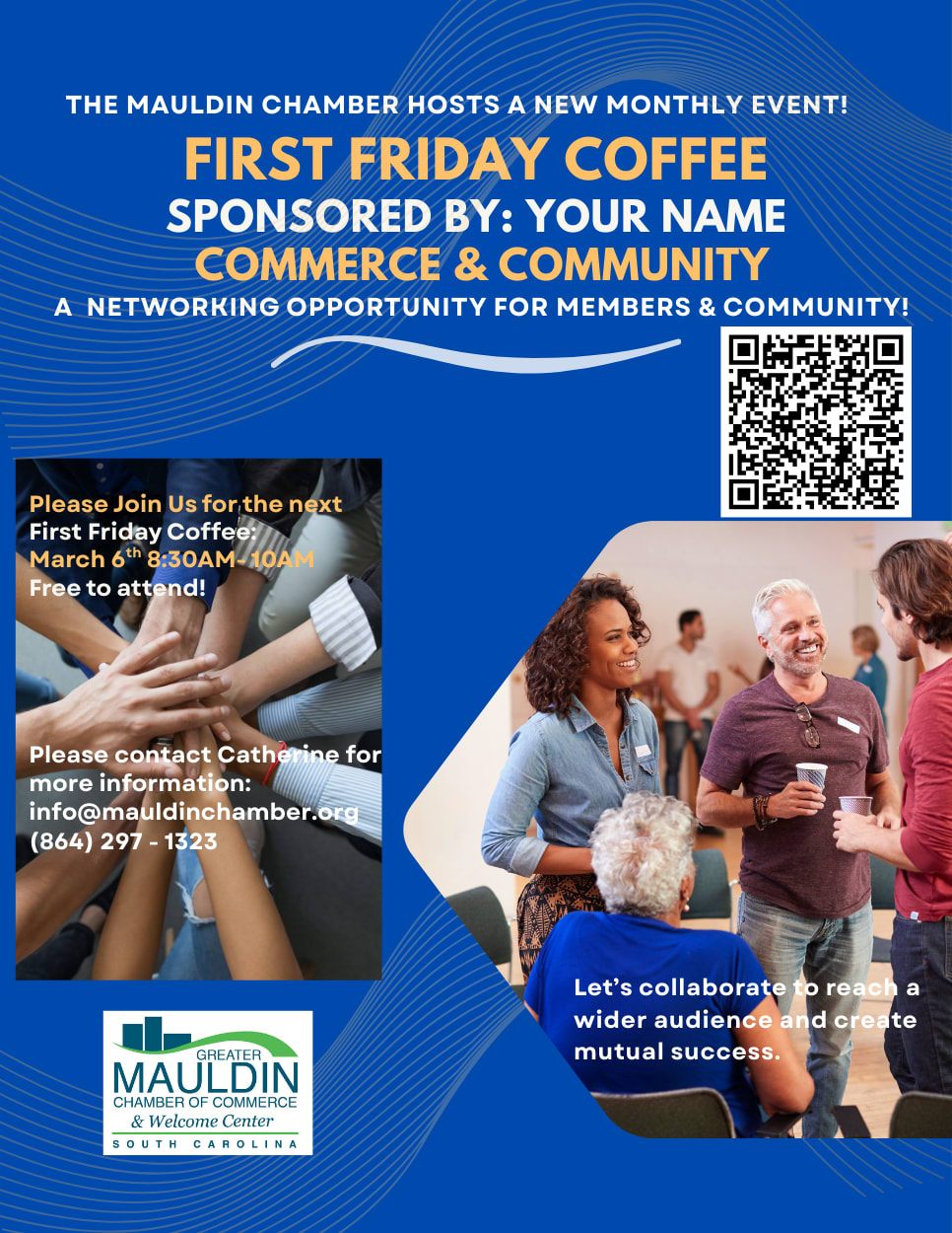 Please RSVP to join the Mauldin Chamber for First Friday Coffee A monthly networking event for Commerce & Community!