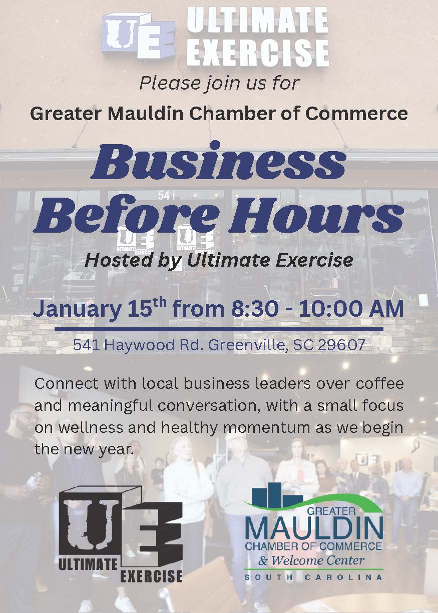Please join the Mauldin Chamber for a Business Before Hours hosted by Ultimate Exercise.